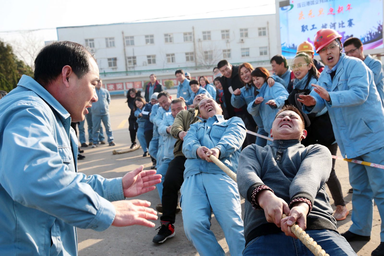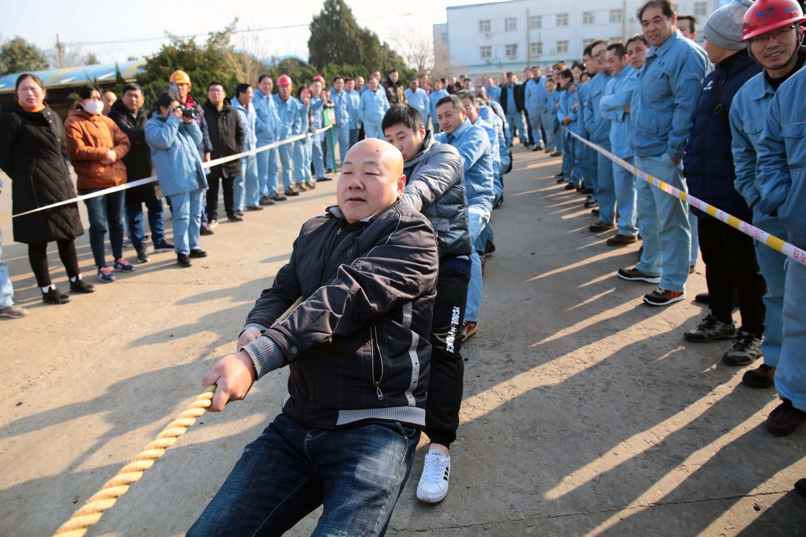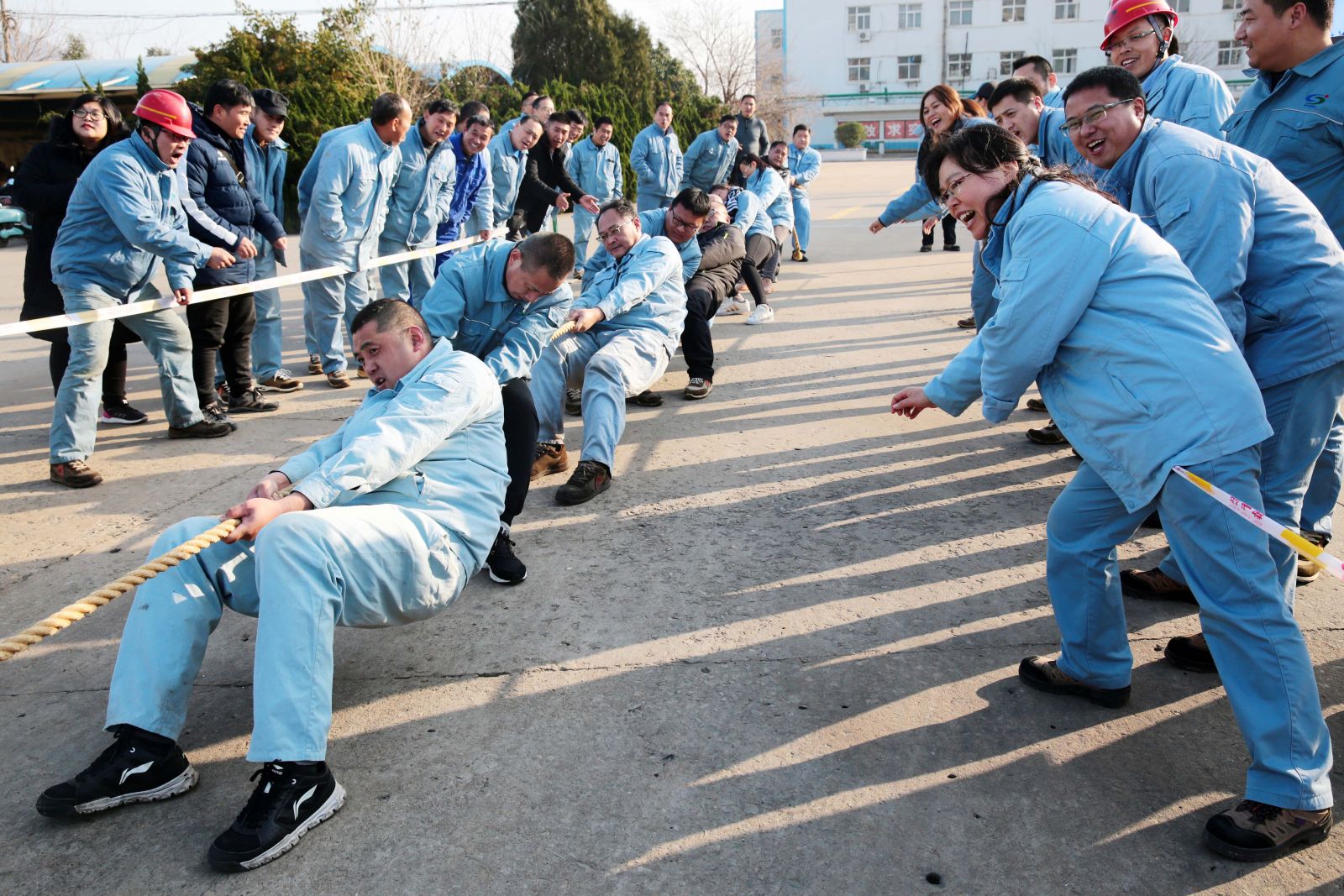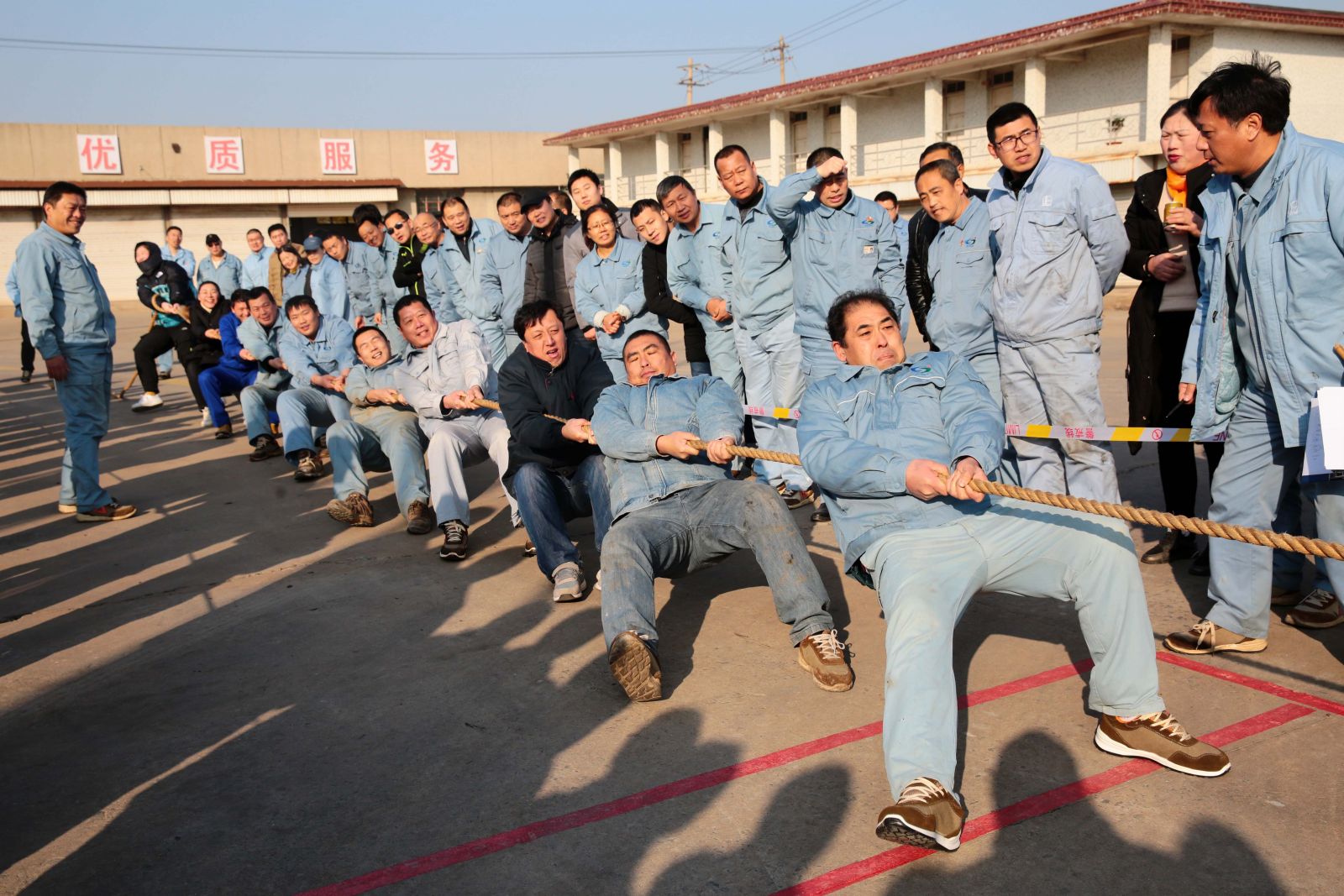 隨著裁判的一聲哨響,各名選手緊握繩索,咬緊牙關,一觸即發,彎腰、下蹲、跨步,后仰、發力,整個動作整齊劃一,一氣呵成。未參賽的員工自發組成啦啦隊為比賽隊員助威,加油聲、吶喊聲、喝彩聲,此起彼伏,飄蕩在公司上空。