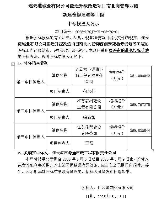 搬遷升級改造項目南北向管廊西側新建檢修通道等工程中標候選人公示