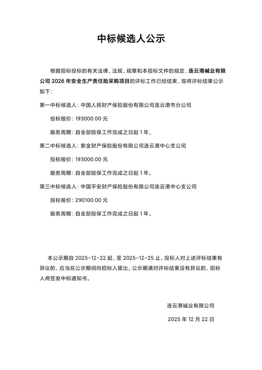 連云港堿業有限公司2026年安全生產責任險采購項目中標候選人公示