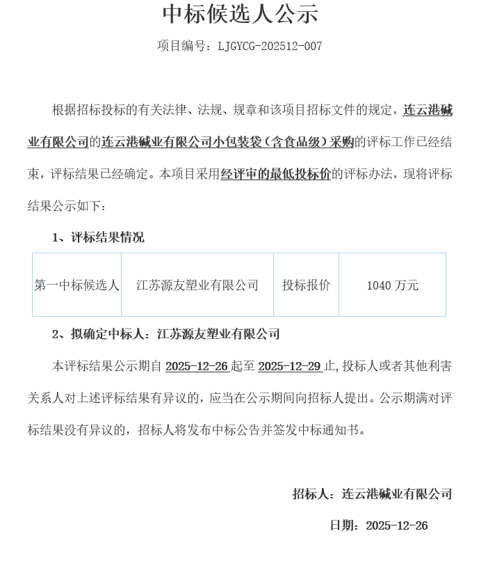 連云港堿業有限公司的連云港堿業有限公司小包裝袋(含食品級)采購中標候選人公示