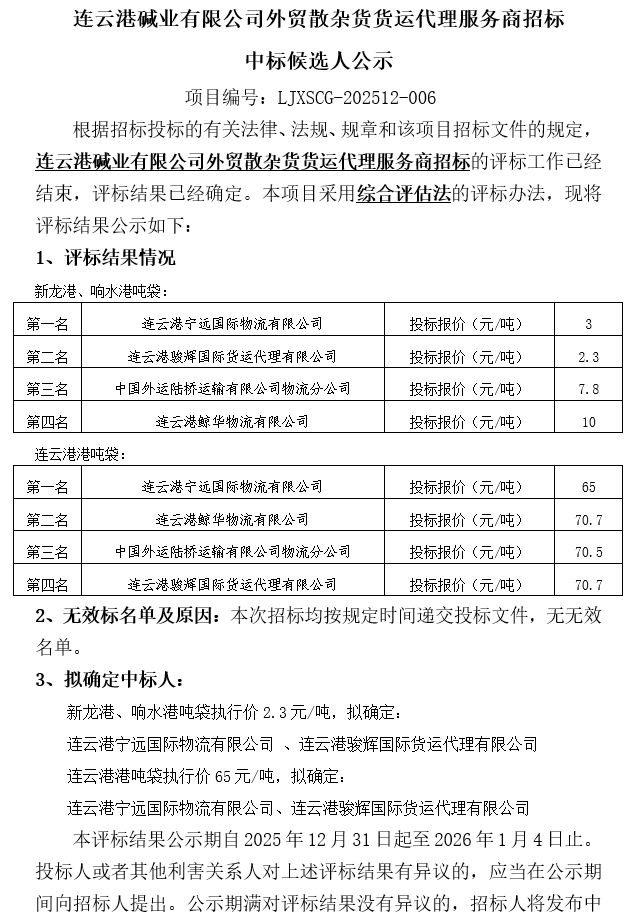 連云港堿業有限公司外貿散雜貨貨運代理服務商招標中標候選人公示