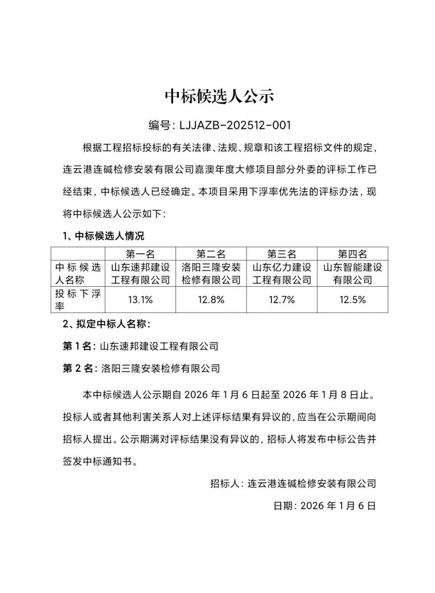連云港連堿檢修安裝有限公司嘉澳年度大修項目中標候選人公示