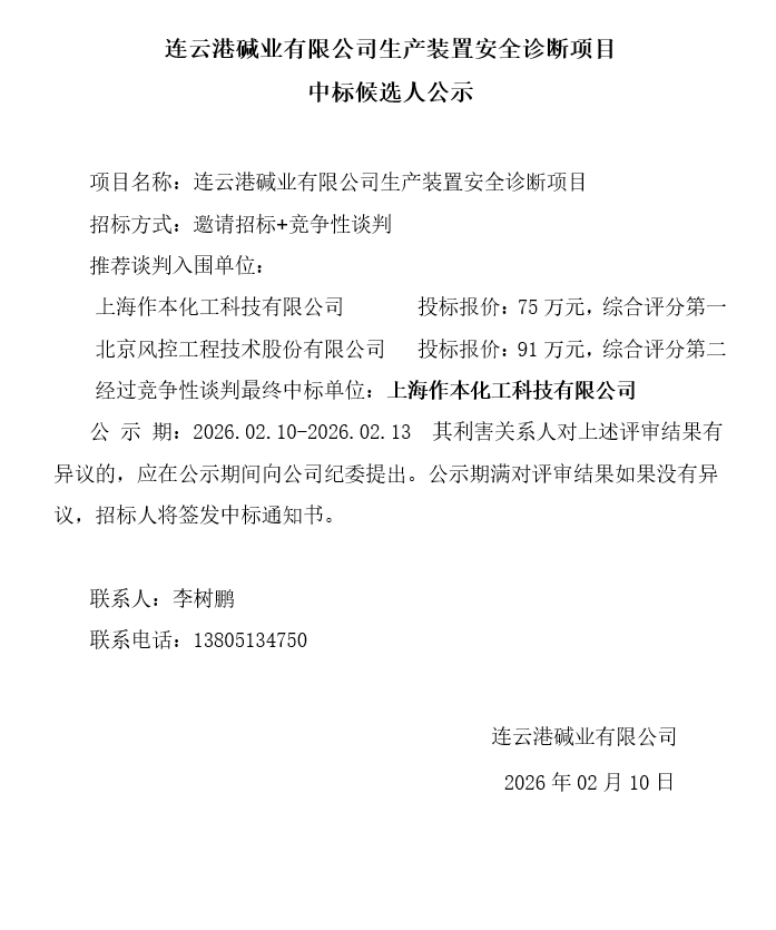 連云港堿業(yè)有限公司生產(chǎn)裝置安全診斷項目中標候選人公示