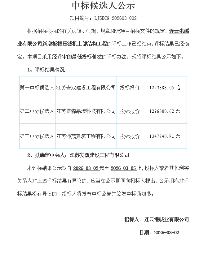 連云港堿業(yè)有限公司新增板框壓濾機上部結構工程中標候選人公示