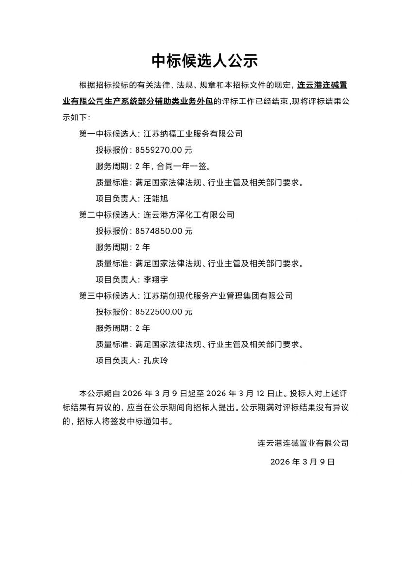 連云港連堿置業有限公司生產系統部分輔助類業務外包中標候選人公示