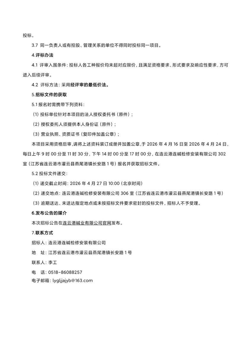 連云港連堿檢修安裝有限公司焦化項目維??蚣軈f(xié)議招標公告
