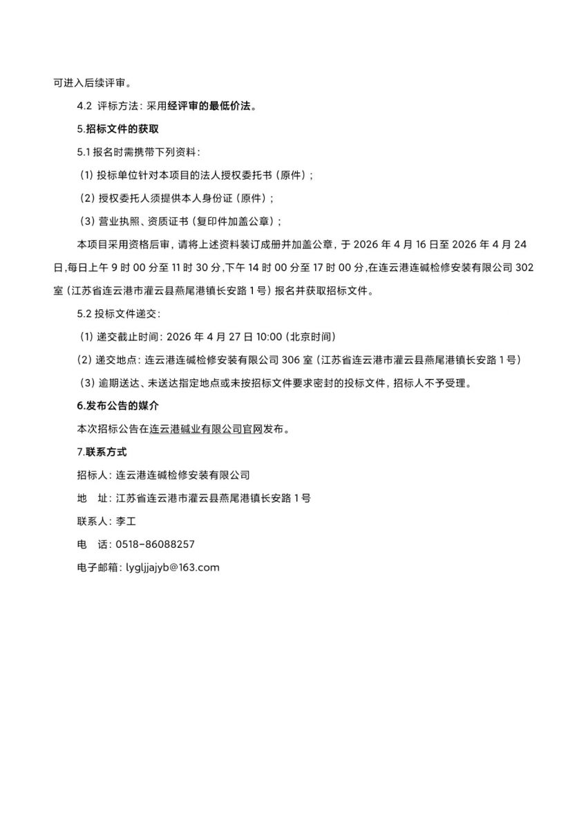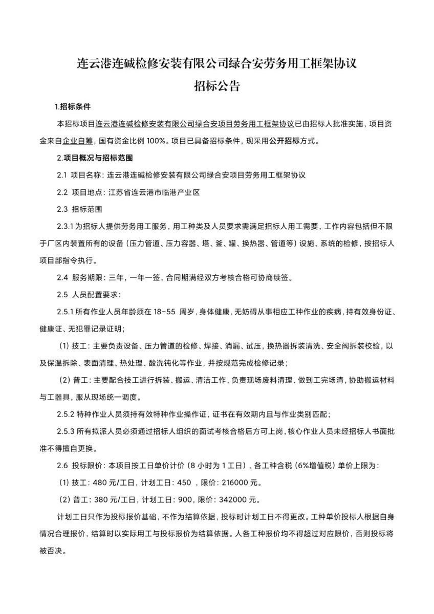連云港連堿檢修安裝有限公司綠合安勞務用工框架協議招標公告