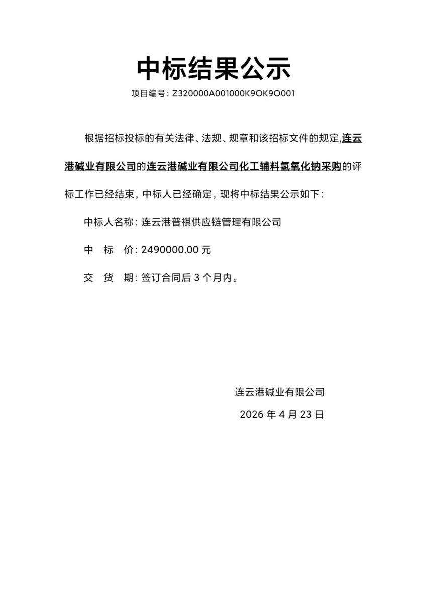連云港堿業有限公司化工輔料氫氧化鈉采購中標結果公示
