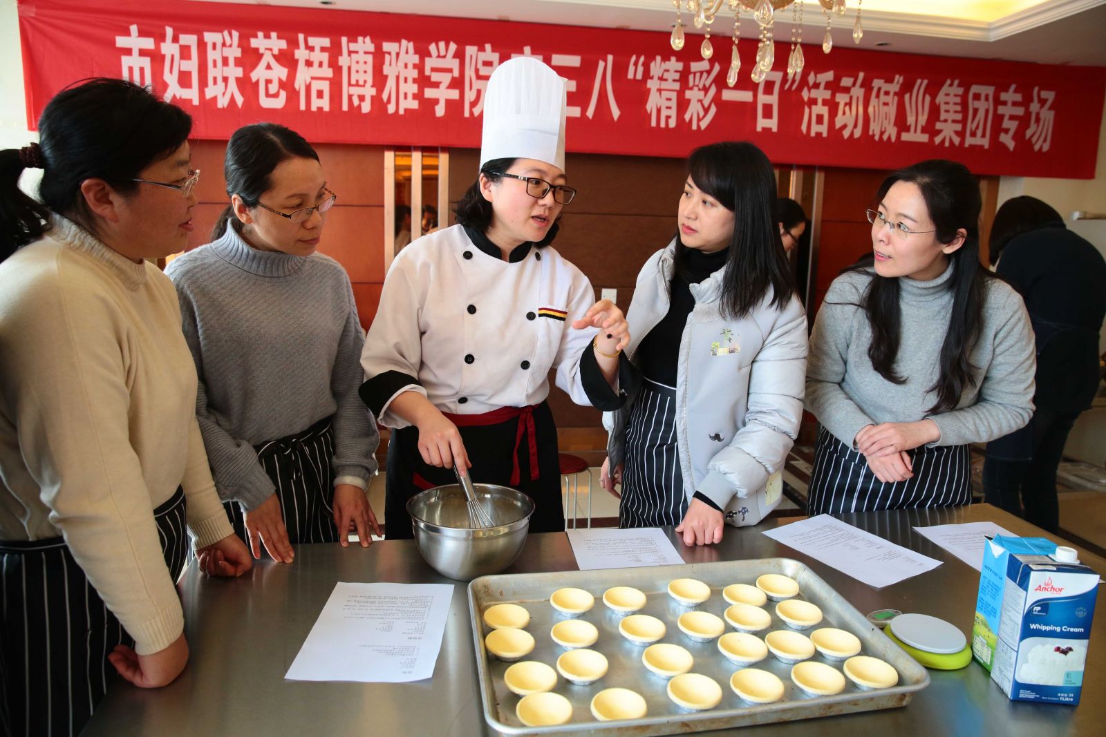 烘焙培訓中,只見大家稱量、打蛋、調黃油,在老師的指導和幫助下,紛紛化身“小廚娘”,投身“甜蜜事業”。當打開烤箱的那一刻,香味四溢,現場彌漫著快樂和幸福的味道。