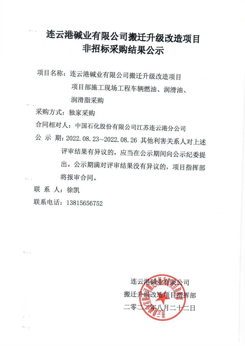 搬遷升級改造項目施工現場工程車輛燃油、潤滑油、潤滑脂采購結果公示