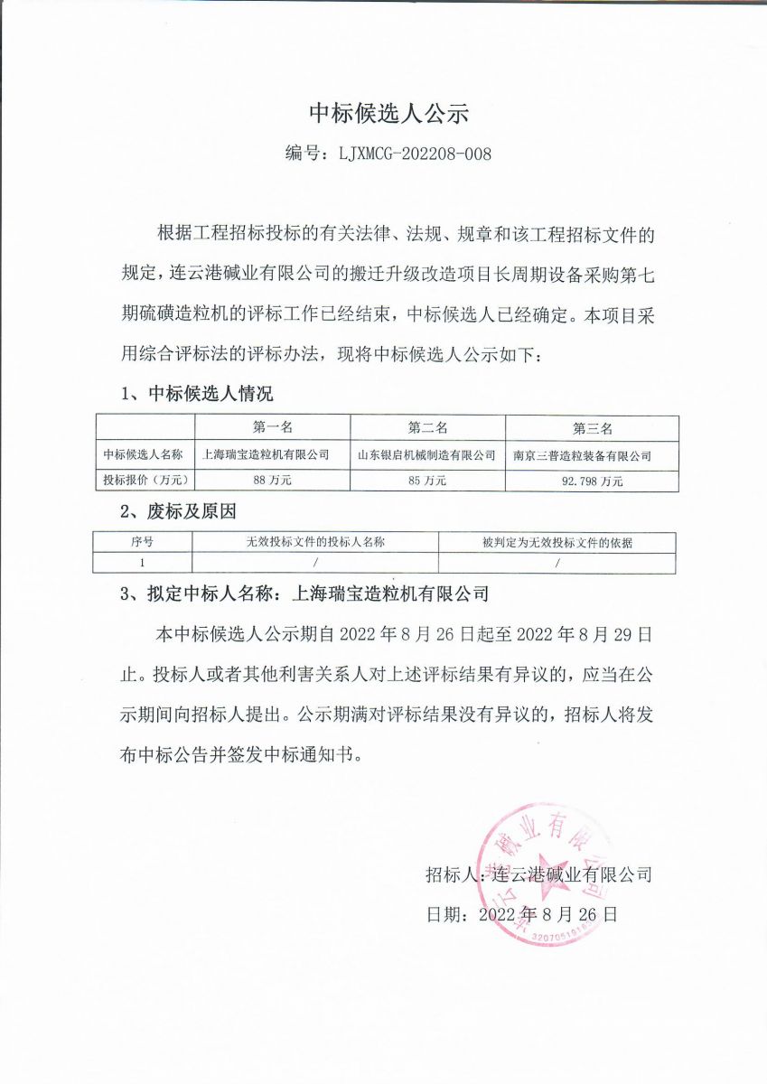 搬遷升級改造項目硫磺造粒機中標候選人公示