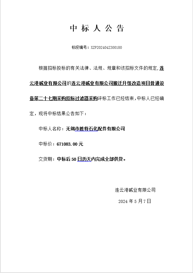 搬遷升級改造項目普通設備第二十七期采購招標過濾器采購中標人公告