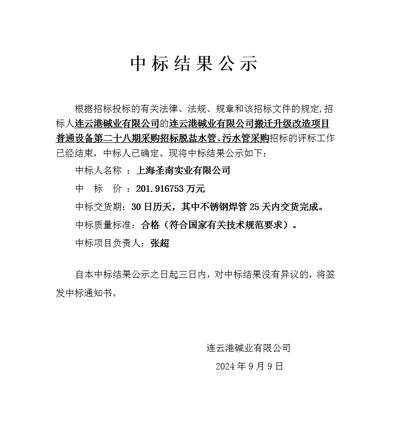 搬遷升級改造項(xiàng)目普通設(shè)備第二十八期采購招標(biāo)脫鹽水管、污水管采購中標(biāo)結(jié)果公示