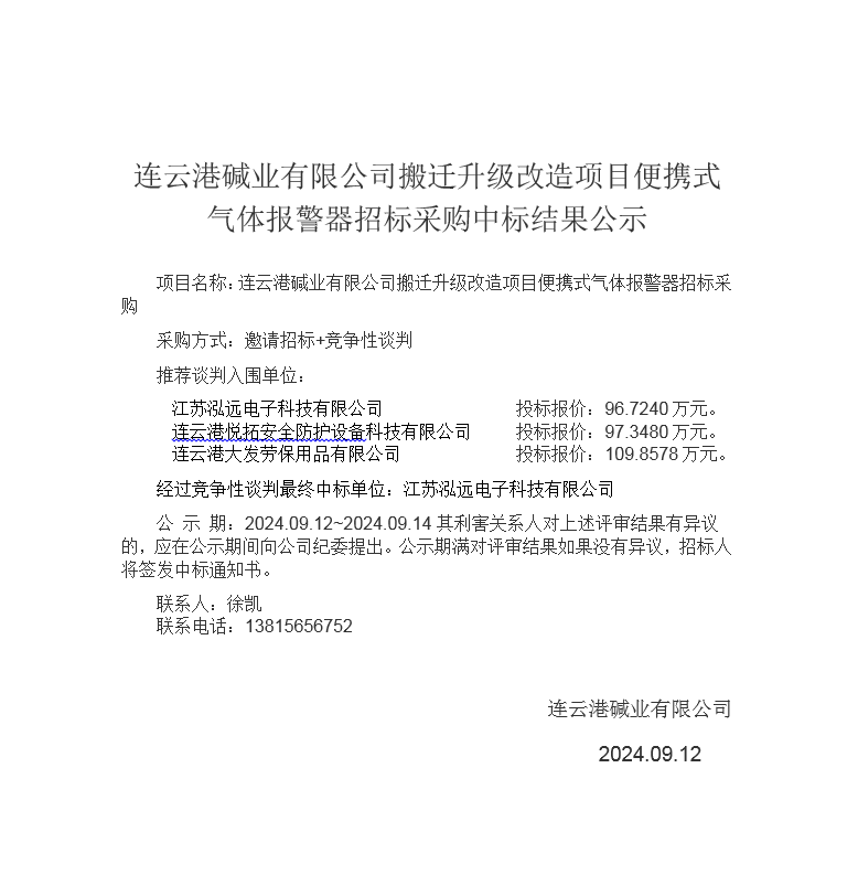 搬遷升級改造項目便攜式氣體報警器招標采購中標結果公示
