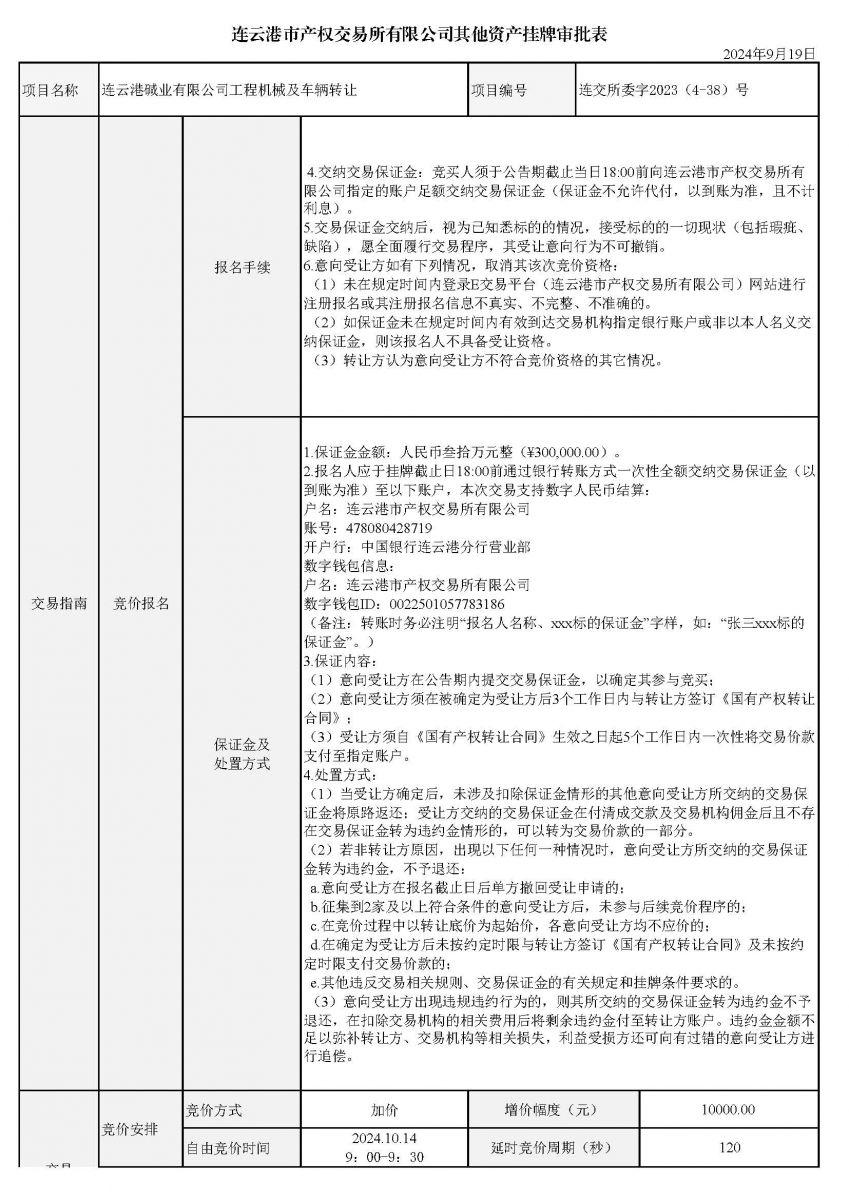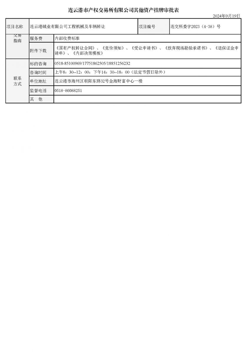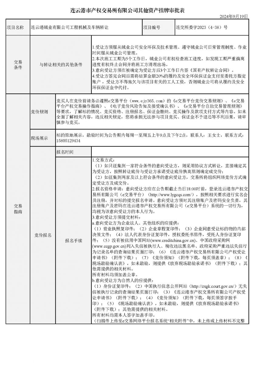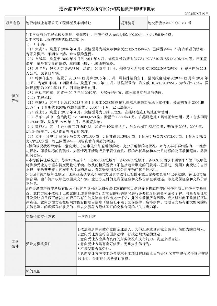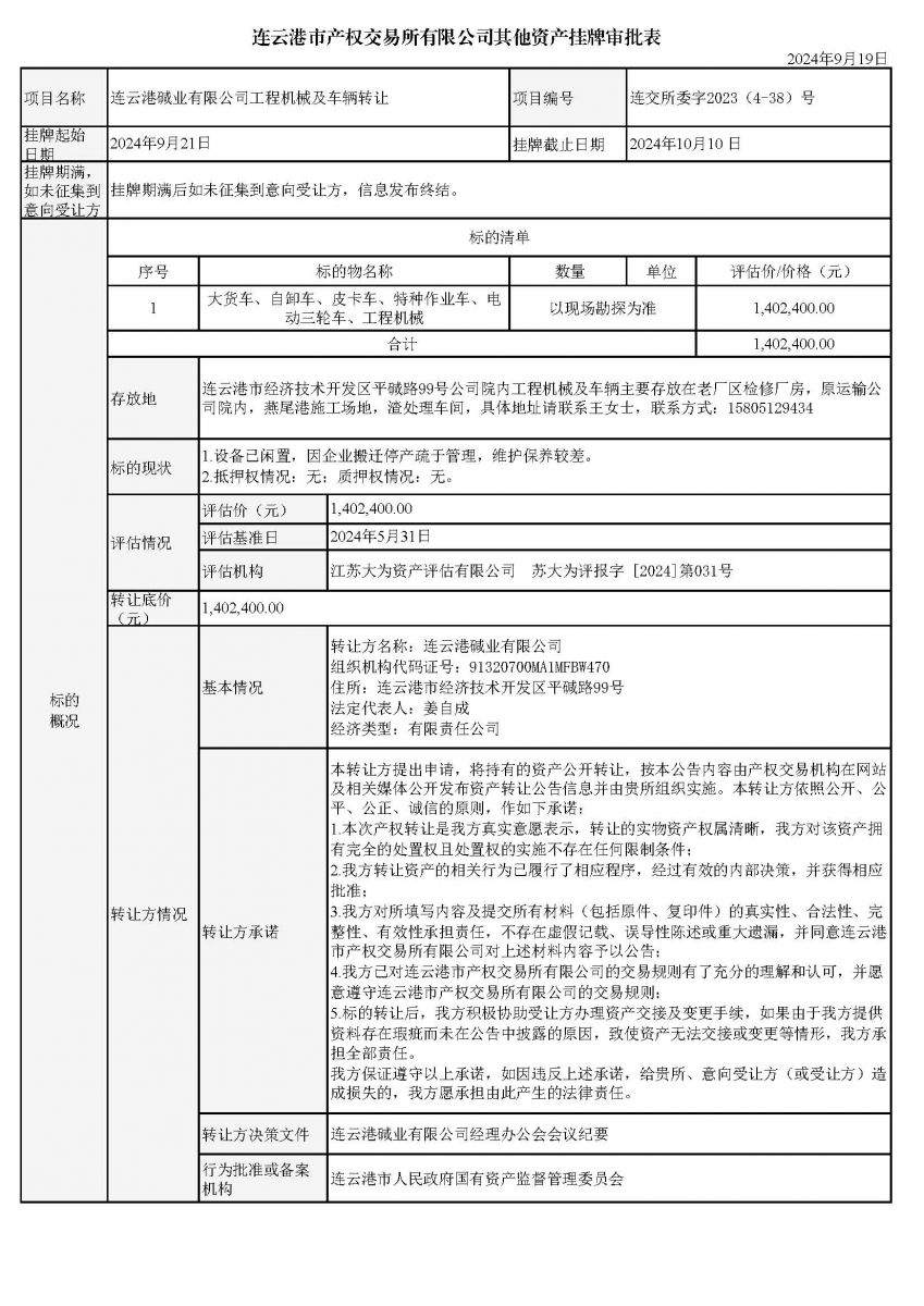 連云港堿業(yè)有限公司工程機(jī)械及車輛轉(zhuǎn)讓資產(chǎn)掛牌審批表