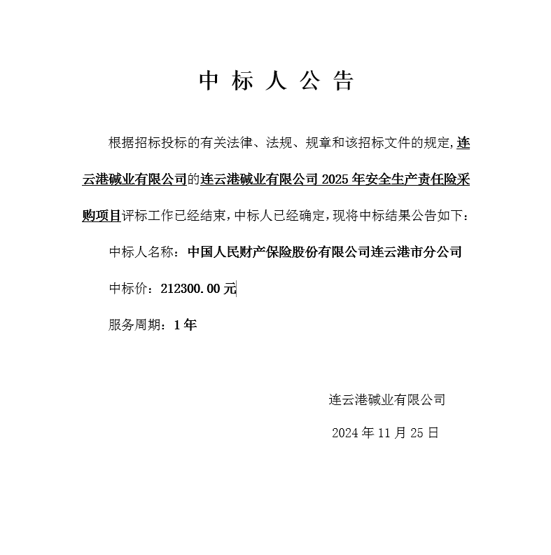 連云港堿業有限公司2025年安全生產責任險采購項目中標人公告