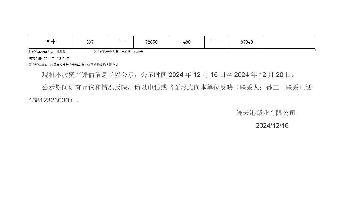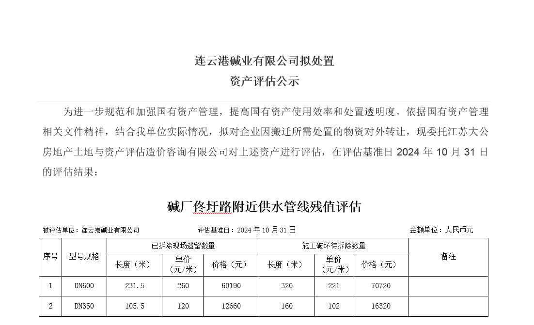 連云港堿業有限公司佟圩路附近供水管線資產評估公示